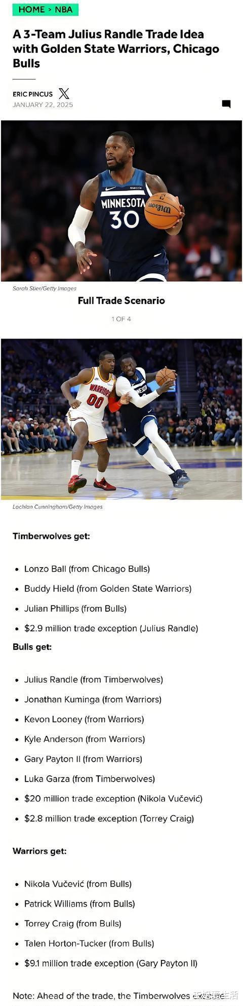 据美国媒体《BR》的 ERIC PINCUS 所提供,有关森林狼、勇士以及公牛的一个涉及 13 人的超级三方交易模拟方案是这样的: